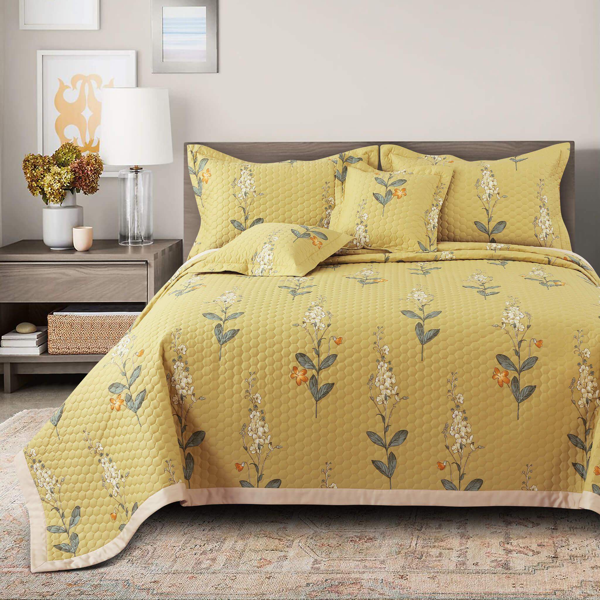 4 - Malako Royale Yellow Botanical 100% Cotton King Size Quilted Bedspread