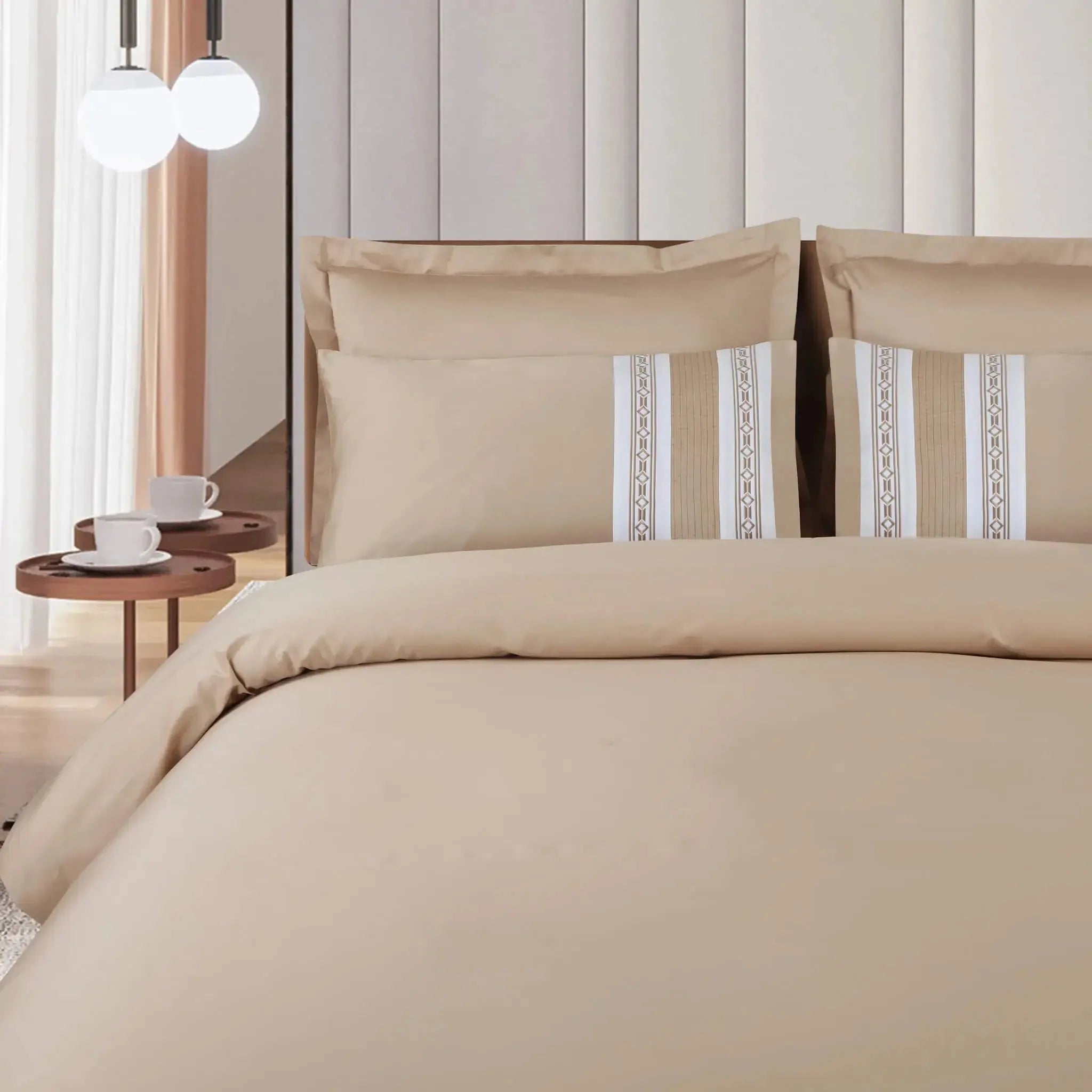 The Vivid Embroidered Beige Duvet Cover Set combines elegance with simplicity. Made from 500 thread count cotton, this 7-piece set includes a plain bedsheet, embroidered pillowcases, plain pillowcases, a plain duvet cover, and a comforter. The neutral beige colour makes it a versatile addition to any bedroom.
