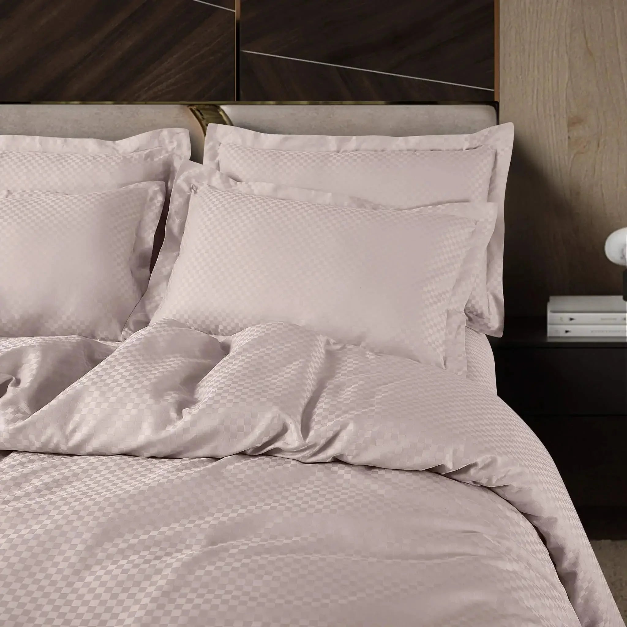 Add a touch of elegance to your bedroom with the Malako Lyon Jacquard Light Beige Checks set. The light beige colour combined with a classic check design creates a soothing and sophisticated atmosphere. The 450 thread count cotton promises a soft and durable finish, ensuring a comfortable night's sleep.
