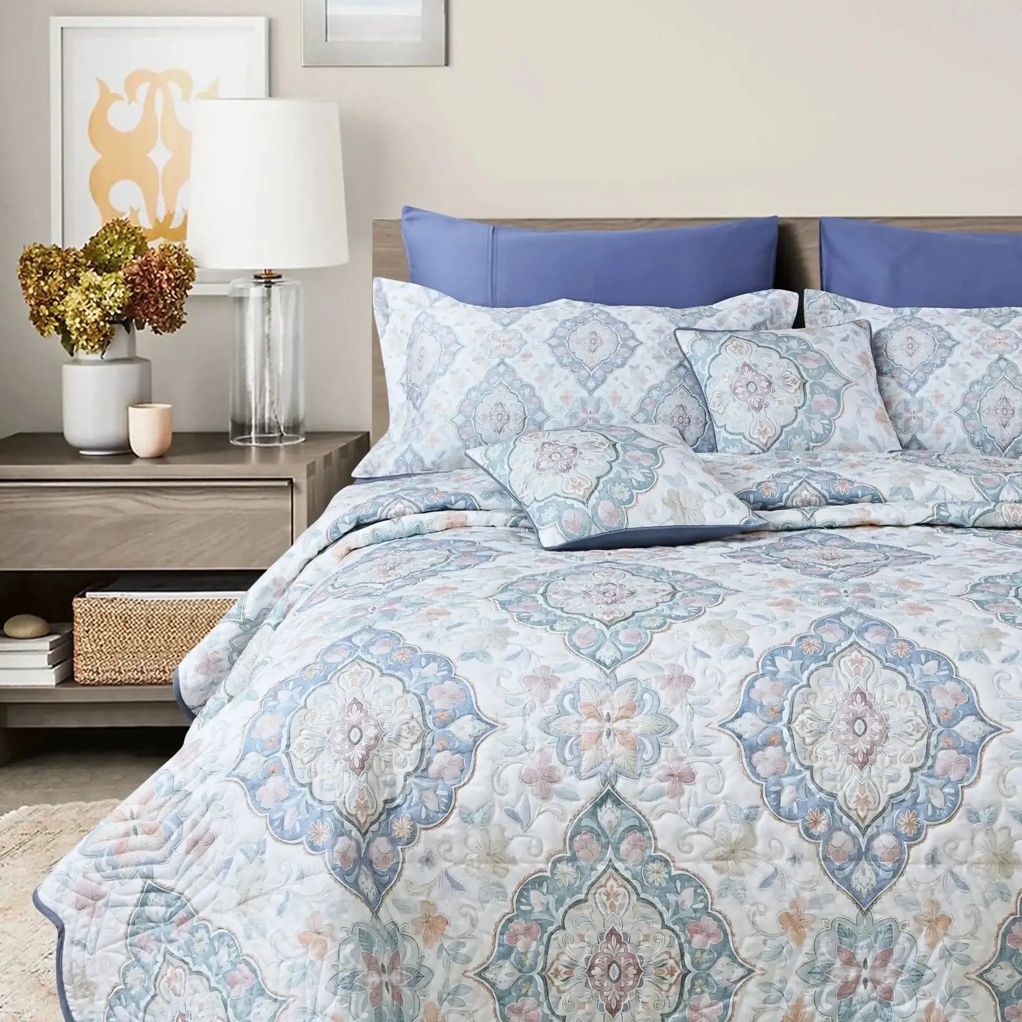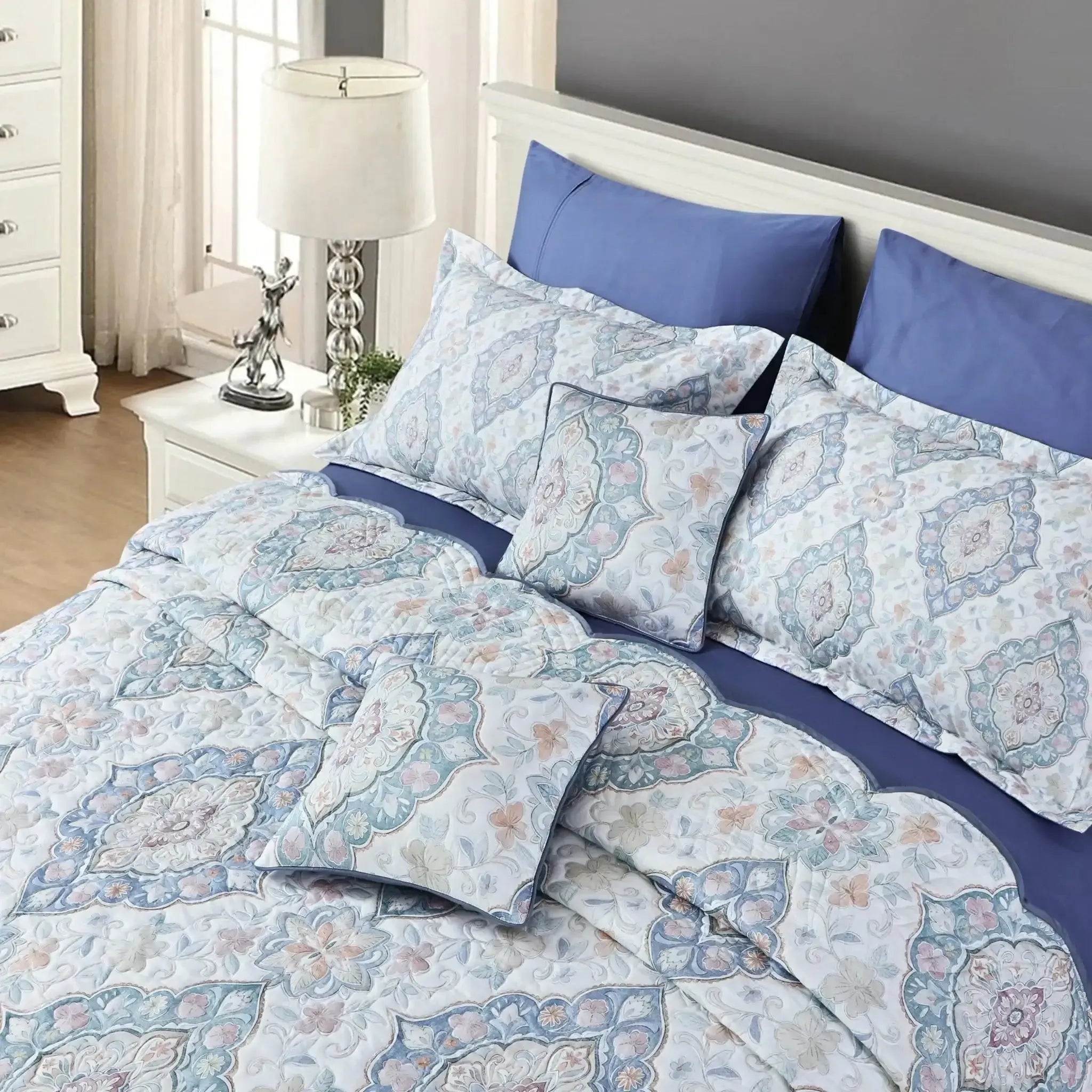 Elevate your bedroom with the Malako Royale 100% Cotton White and Blue Ethnic King Size 5 Piece Quilted Bedspread Set. Includes a quilted bedcover, two pillow covers, and two cushion covers with fillers in a stylish white and blue ethnic design.
