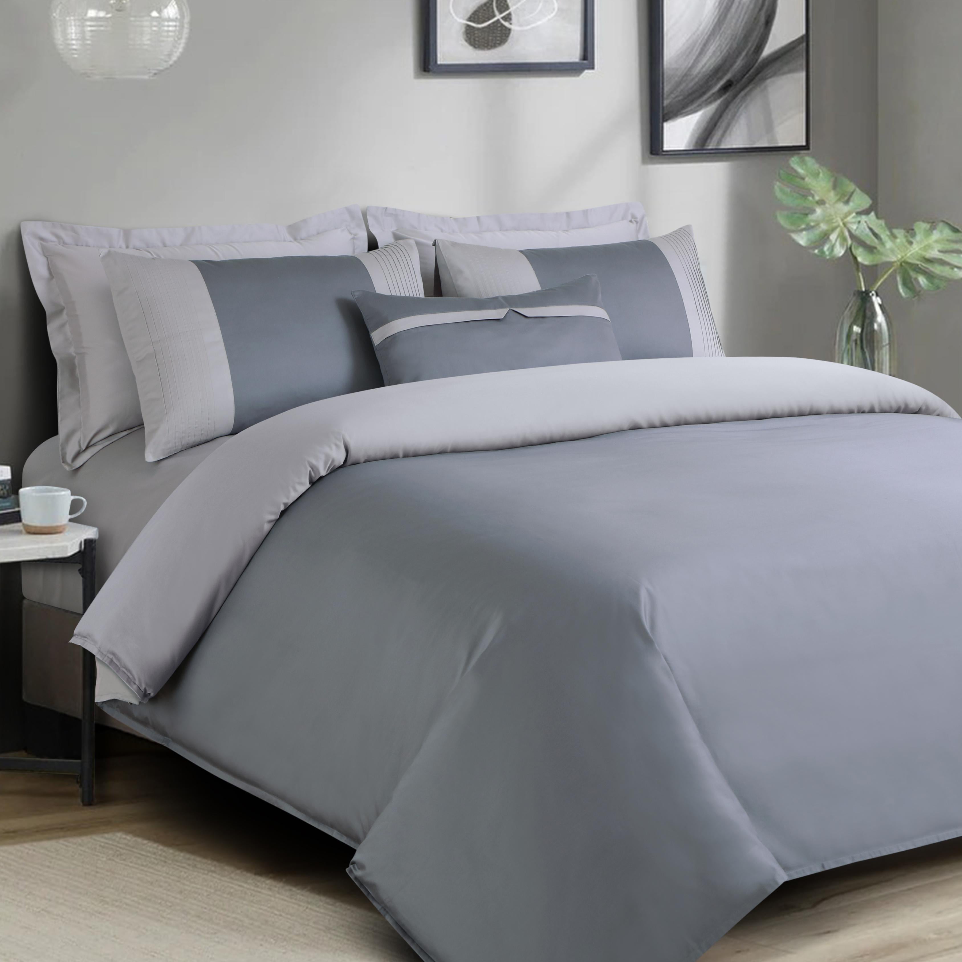 Gray bedding set on a bed in a modern bedroom with decor elements.