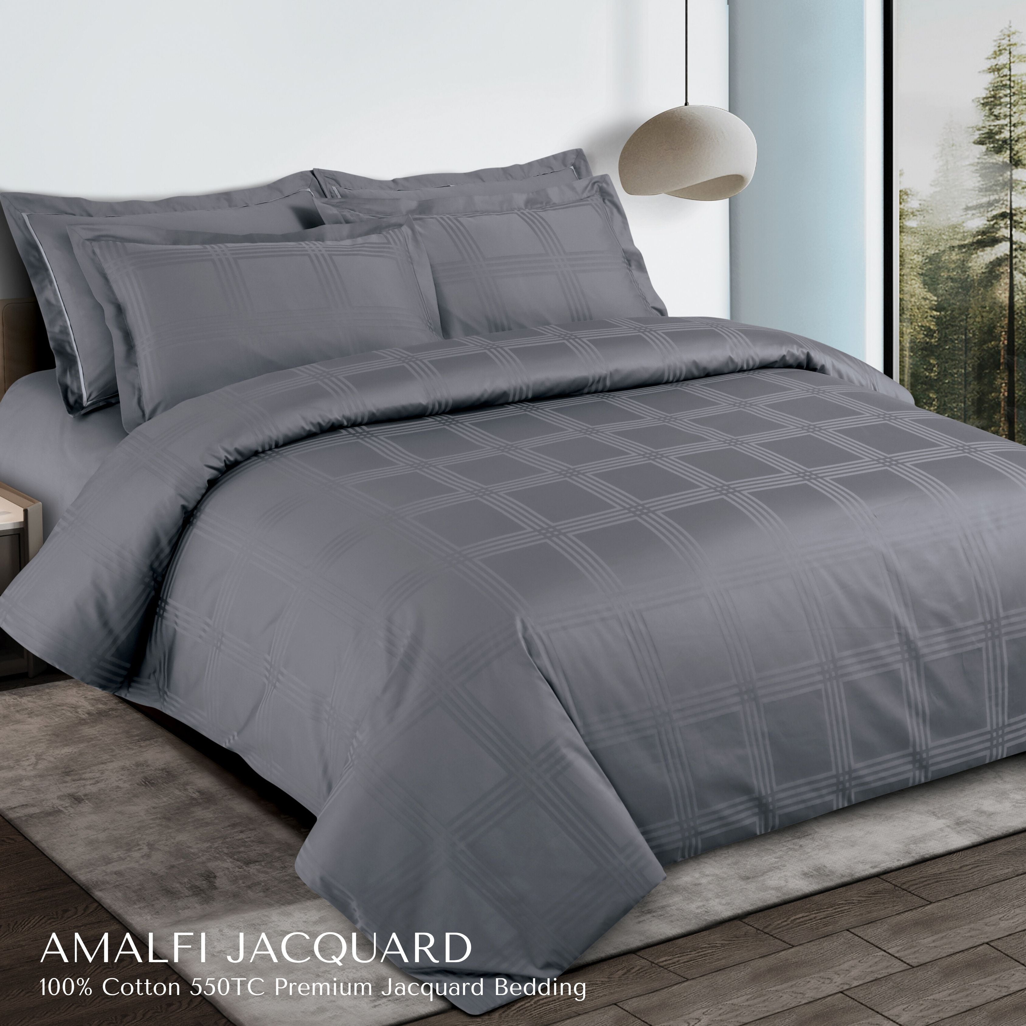 The Amalfi Collection blends modern design with artisanal craftsmanship. Featuring a versatile Grey jacquard checkered pattern, this duvet cover set is perfect for creating a calming, refined environment in any bedroom. Designed for comfort and timeless elegance, it’s an effortless upgrade for master suites or guest rooms alike.