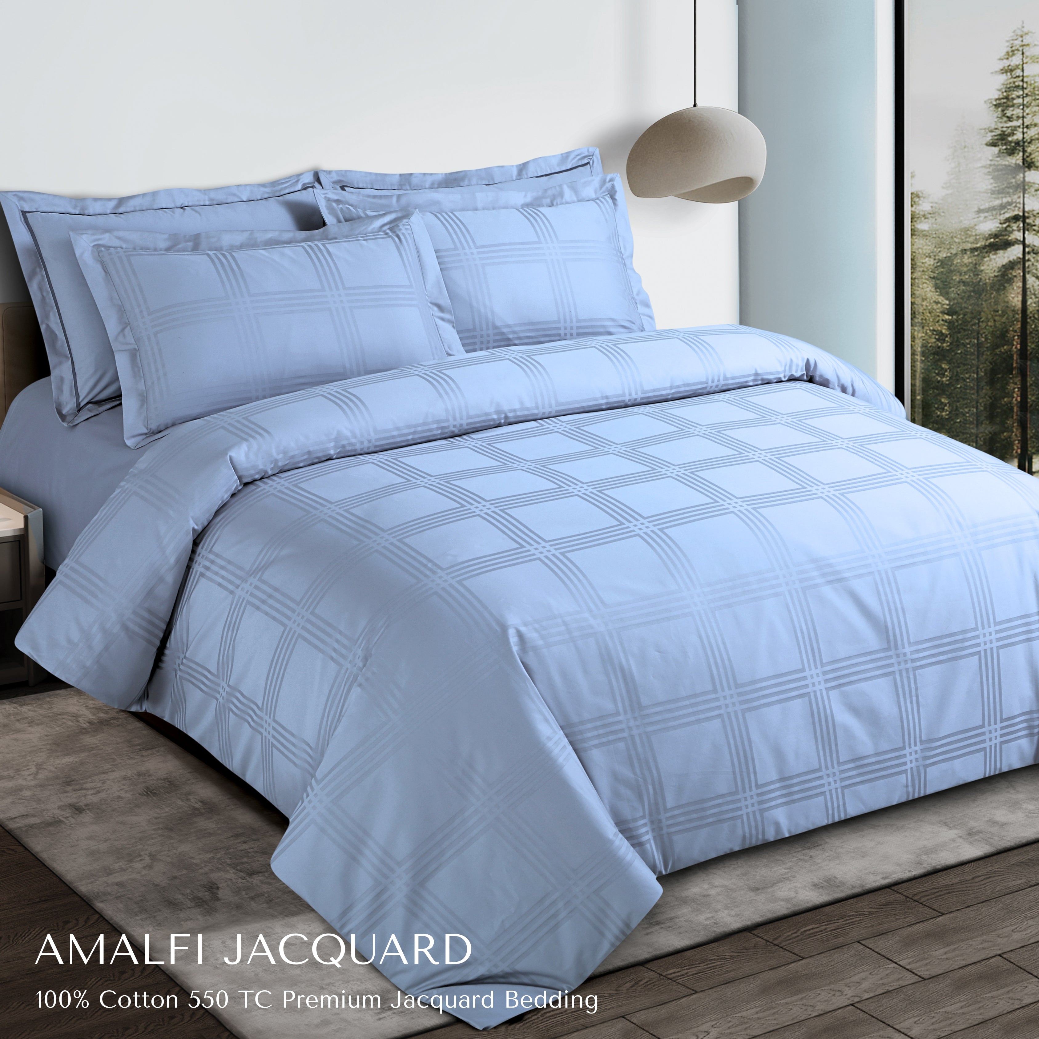 Malako Amalfi Jacquard Pigeon Blue Checks 550 TC 100% Cotton King Size Duvet Cover Set