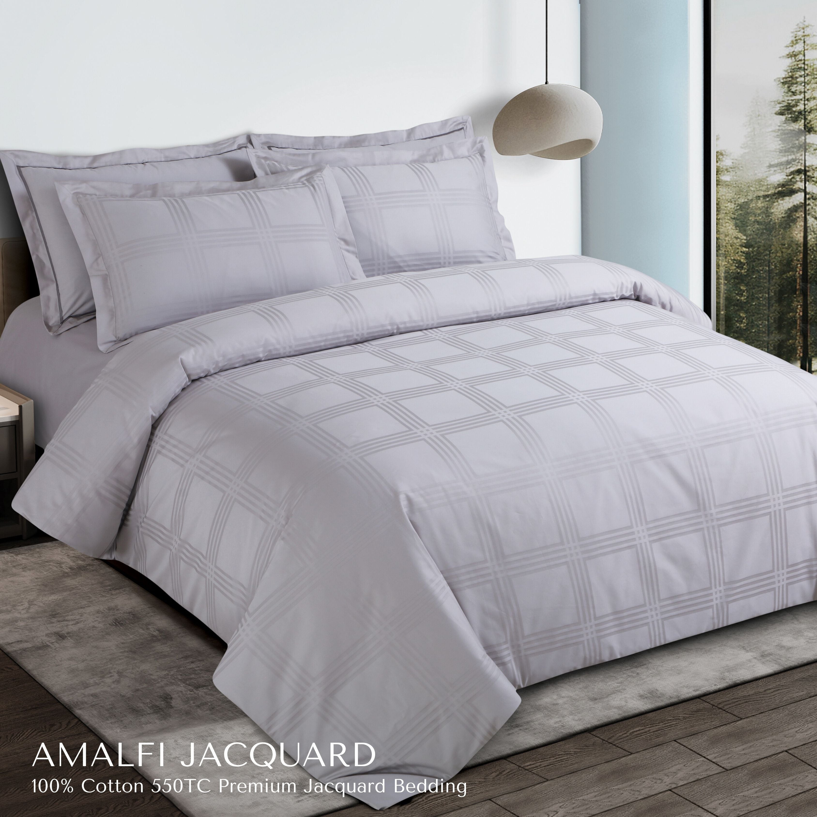 The Amalfi Collection combines timeless Italian textile artistry with modern sophistication. Featuring a luminous Silver Grey checkered jacquard weave, this duvet cover set delivers plush comfort and an elevated, hotel-style ambiance. Crafted for all-season luxury, it’s an effortless upgrade for refined bedrooms.