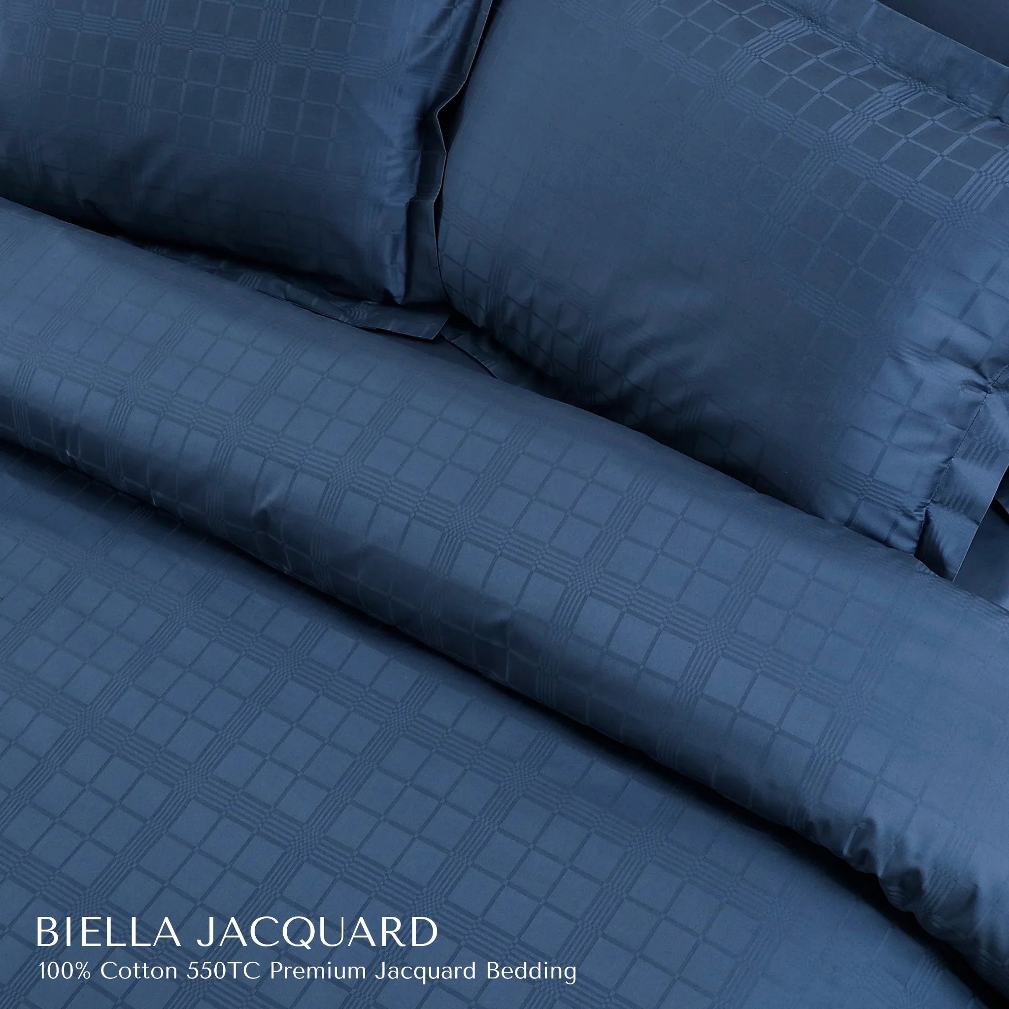 The Biella Jacquard Collection blends Italian craftsmanship with modern sophistication. The Majolica Blue checks bring a vibrant, elegant vibe to your space, while the 550TC cotton ensures long-lasting softness, breathability, and comfort. Perfect for those who love bold yet timeless bedding designs.