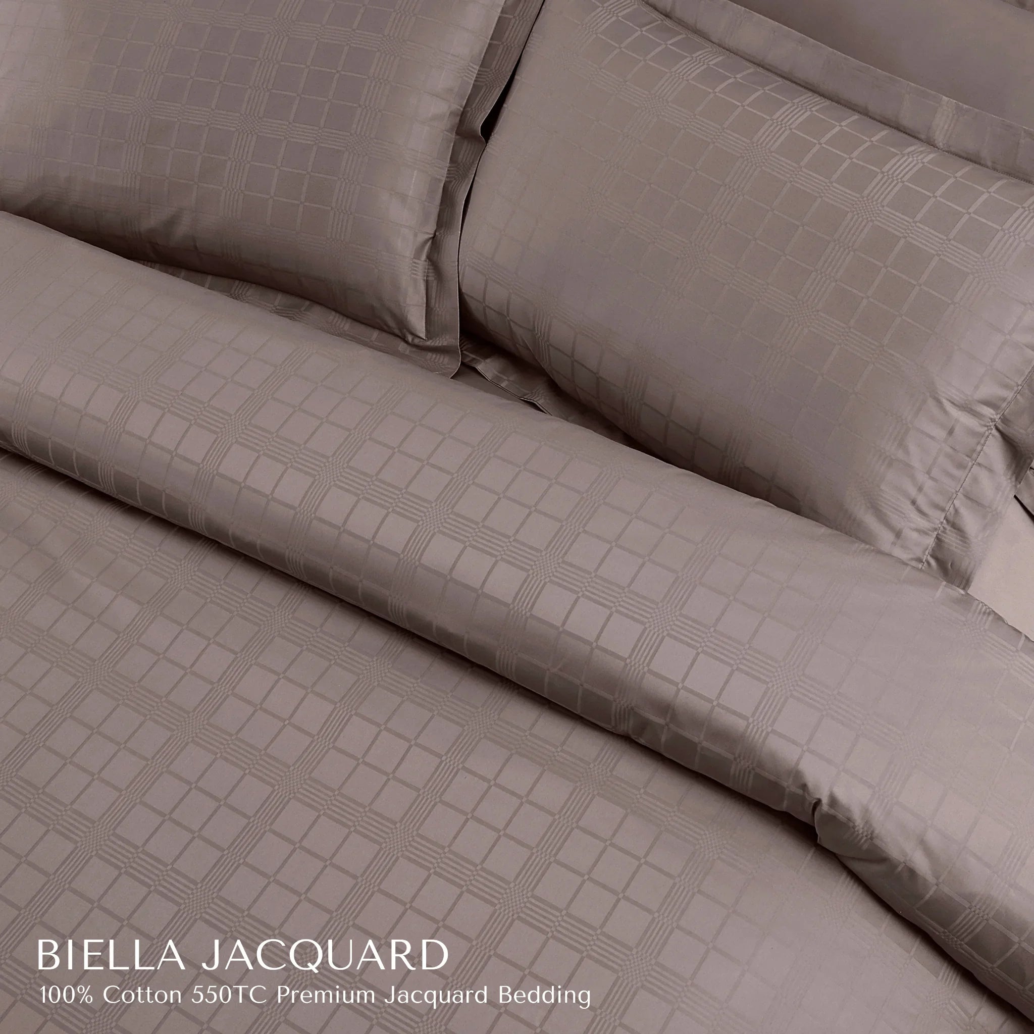 The Taupe Brown Biella Jacquard Duvet Cover Set merges luxurious 550TC cotton with refined Italian-inspired weaving. Its earthy taupe brown tone adds depth and warmth to your bedroom while ensuring breathable comfort. Designed for both elegance and durability, it’s perfect for creating a sophisticated yet welcoming retreat.