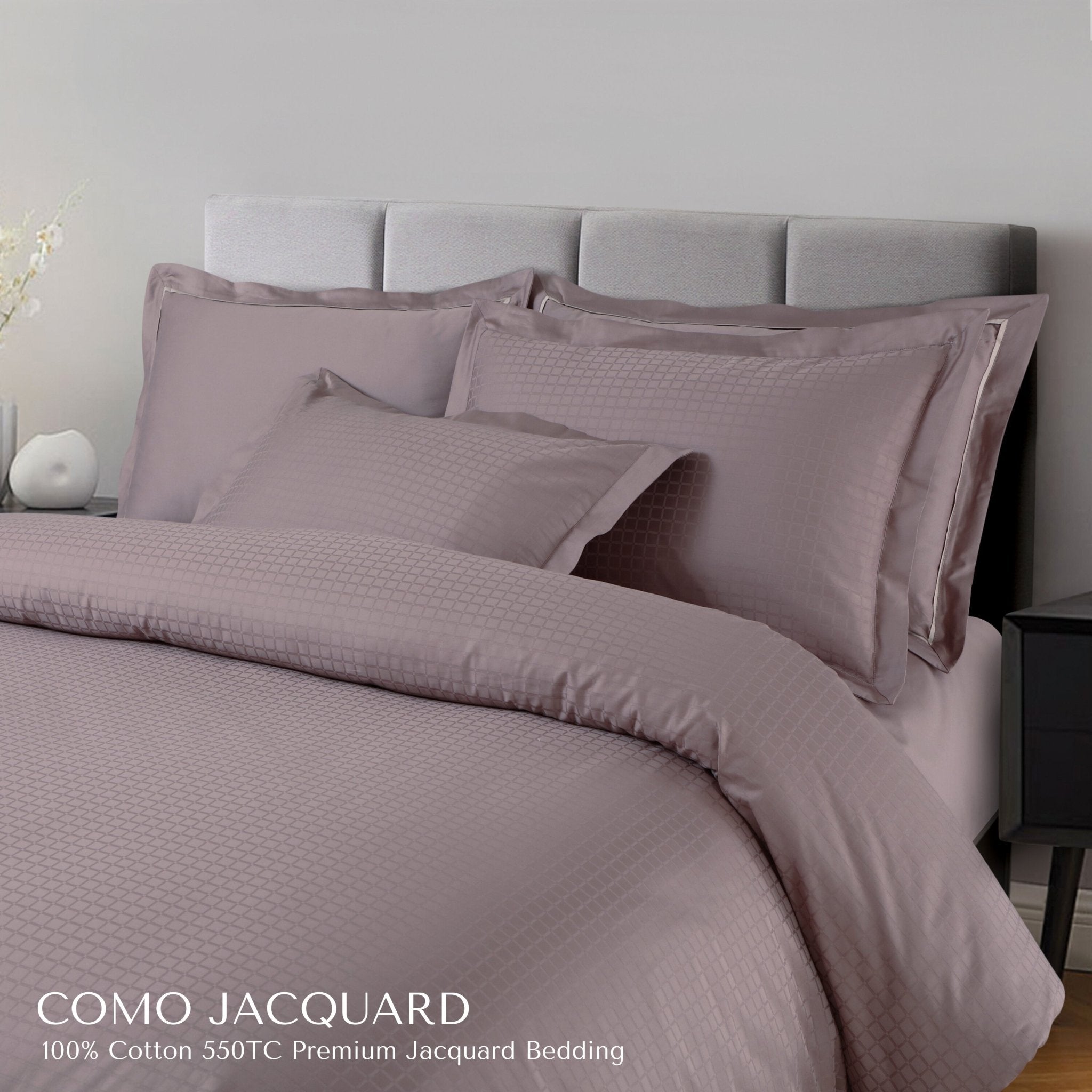 Elevate your bedroom with the Malako Como Jacquard Wine/Mauve Duvet Cover Set. Crafted from 100% cotton with a luxurious 550-thread count and woven using premium Italian jacquard techniques, this 6-piece bedding set offers softness, breathability, and refined design. The bold yet graceful wine-mauve checkered pattern adds depth and sophistication, transforming your room into a stylish sanctuary.