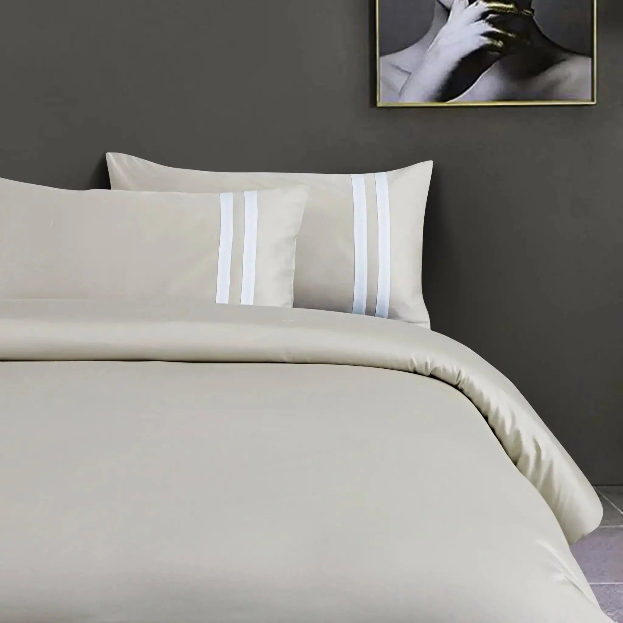 Malako Luxe 550TC 100% Cotton Olive Beige King Size Plain Bedsheet with 2 Striped Pillow Cases