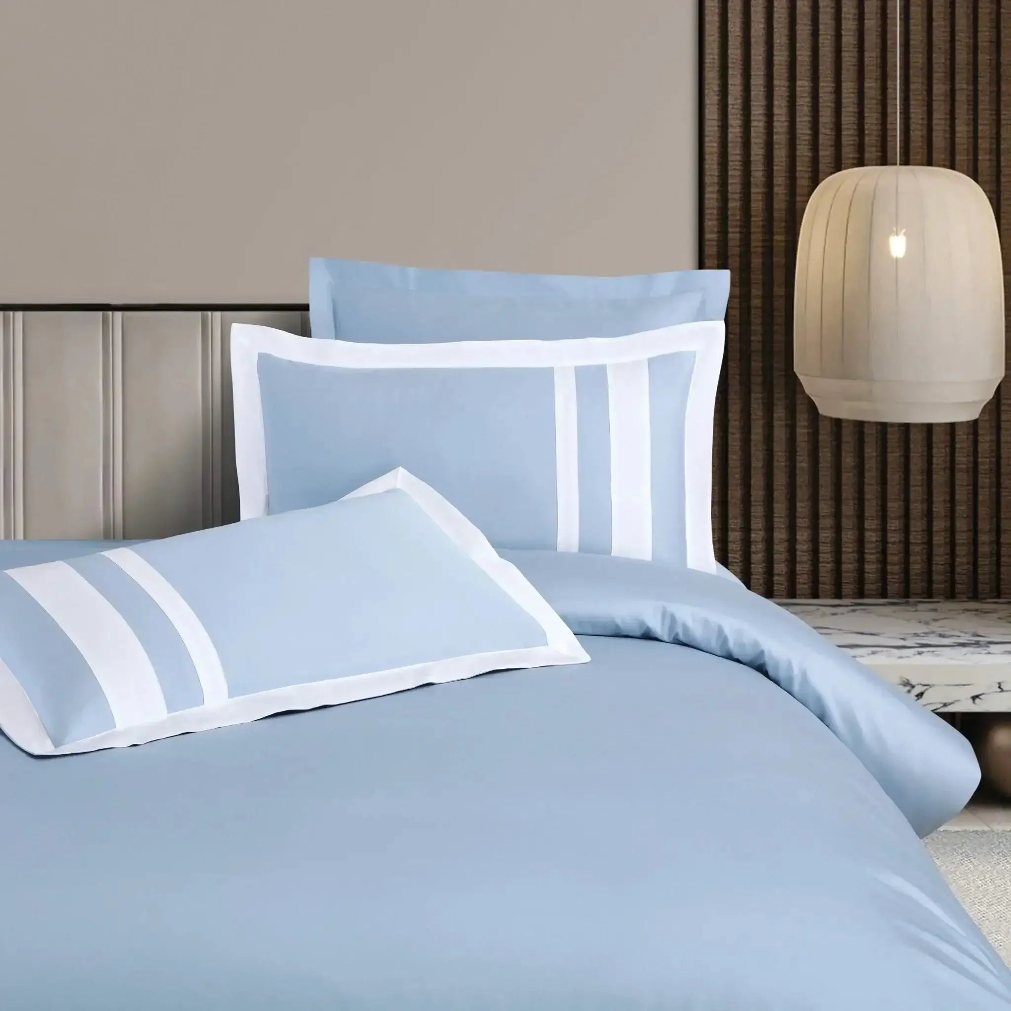 550TC King Size 6-Piece Duvet Cover Set, crafted from 100% premium cotton. The complete set includes one bedsheet, two striped pillow cases, two plain pillow covers and one duvet cover.