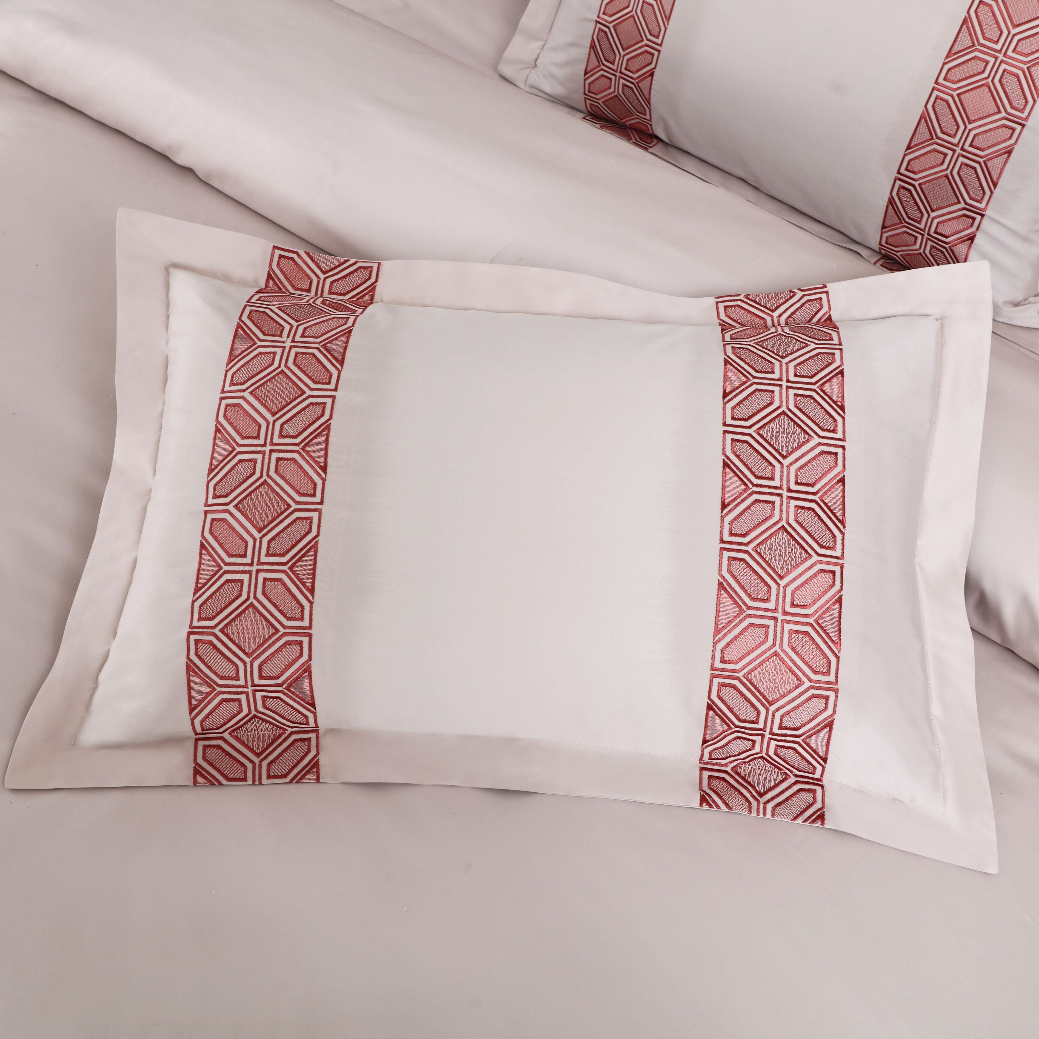 1 King Size Bedsheet (Plain), 2 Embroidered Pillow Cases, 2 Co-ordinated Pillow Cases (Plain) , 1 King Size Duvet Cover (Plain)