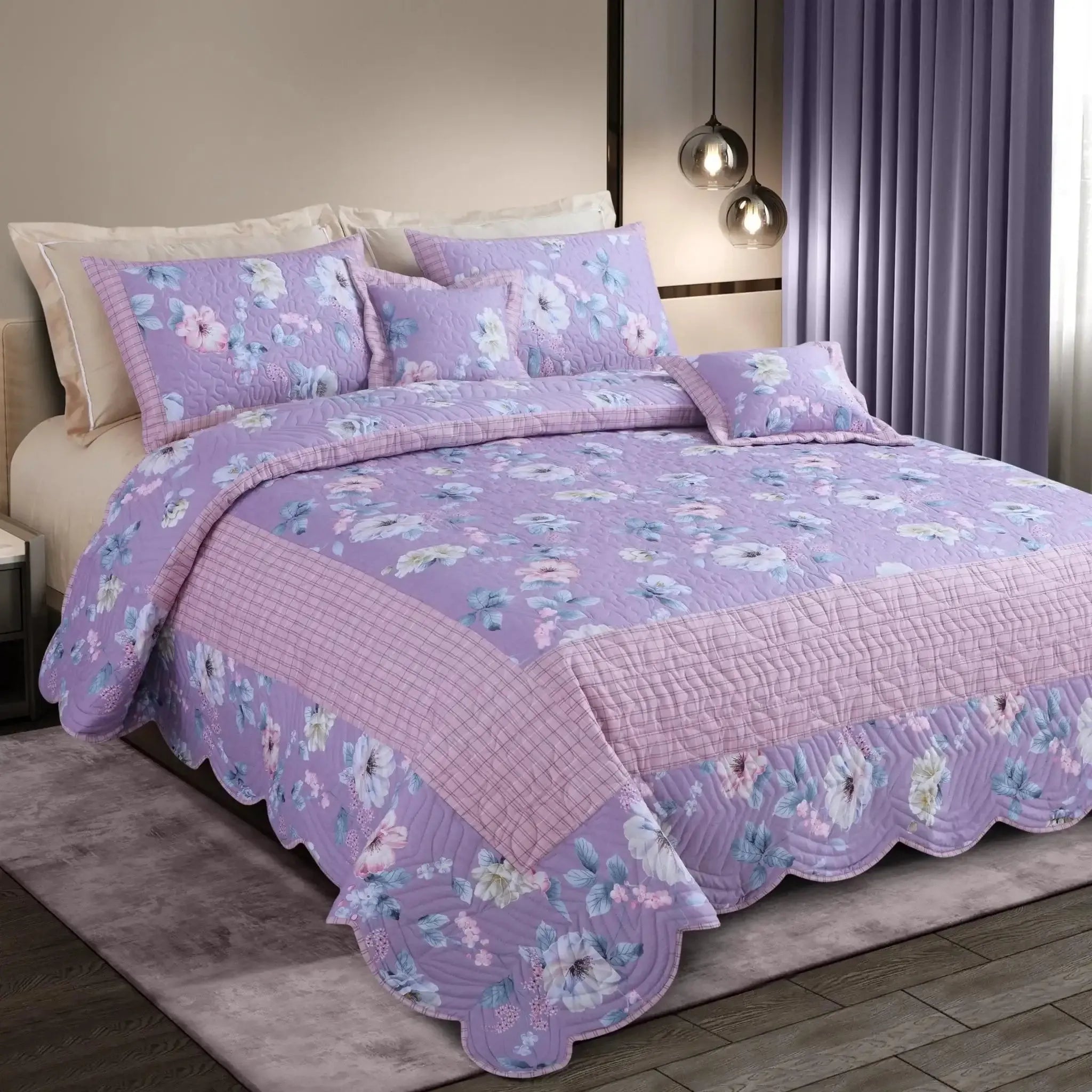 Malako Orchid 100% Cotton Lilac Floral King Size 5 Piece Quilted Bedspread Set