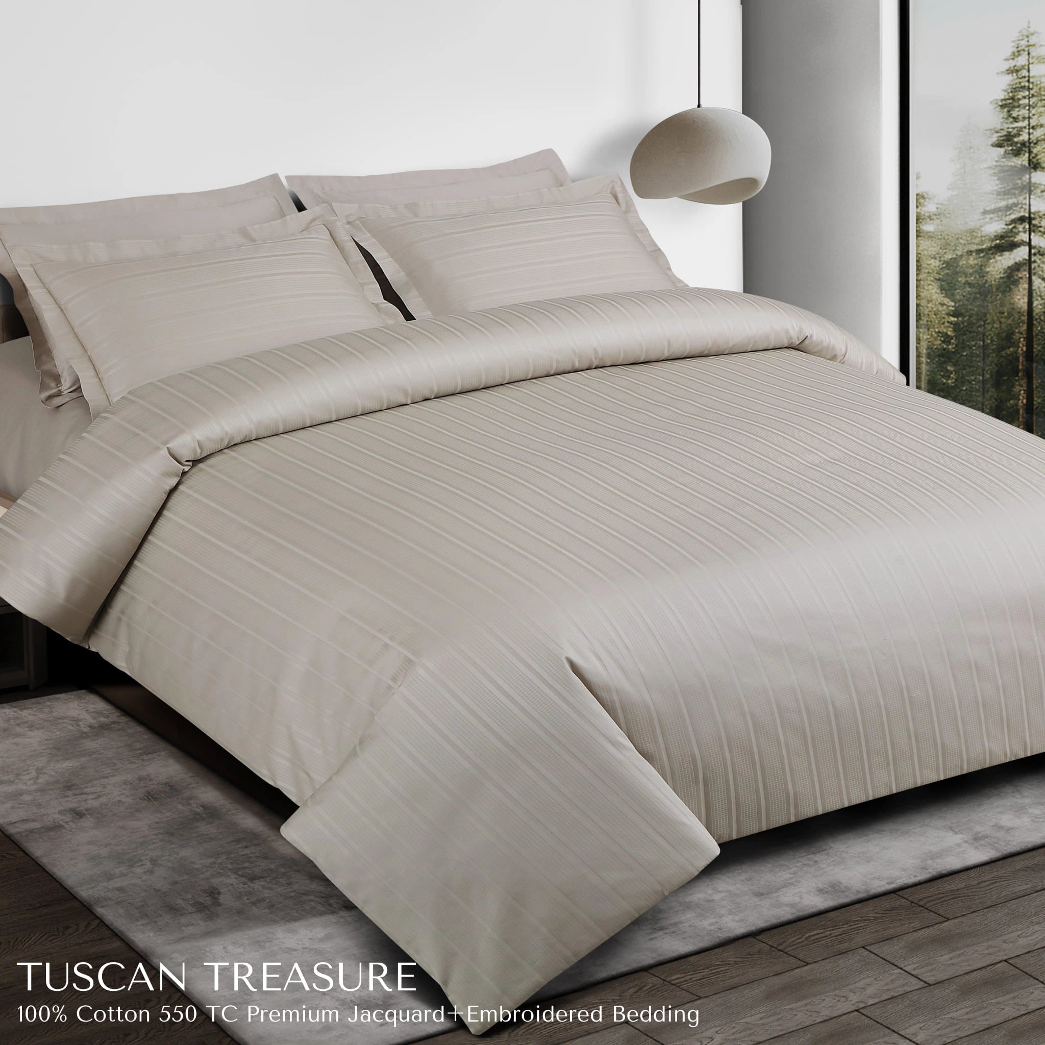 The Tuscan Treasure Collection brings together Italian-inspired jacquard design and delicate embroidered accents on breathable 550TC cotton. The olive beige shade grounds your bedroom with calming tones, while the high-quality construction ensures all-season luxury. Perfect for those who appreciate natural elegance and uncompromised comfort.