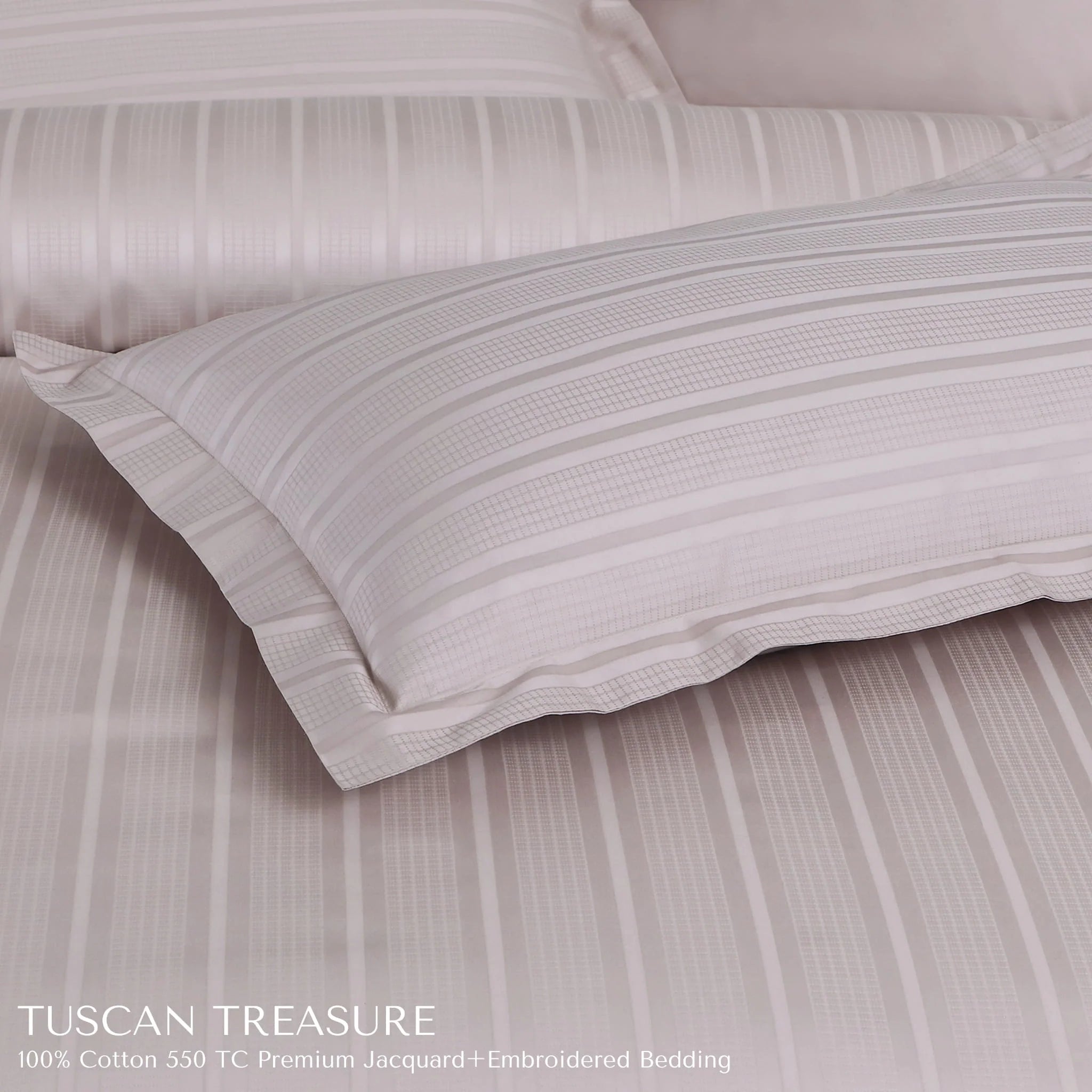 Discover the elegance of Italian-inspired luxury with the Malako Tuscan Treasure 550TC King Size Jacquard Bedding Collection. Crafted from 100% premium cotton with a rich 550 thread count, this set blends intricate jacquard weaving with delicate embroidery for a soft, breathable, and refined sleep experience. The timeless Almond Beige shade with subtle stripes elevates your bedroom décor with a sophisticated Tuscan charm.