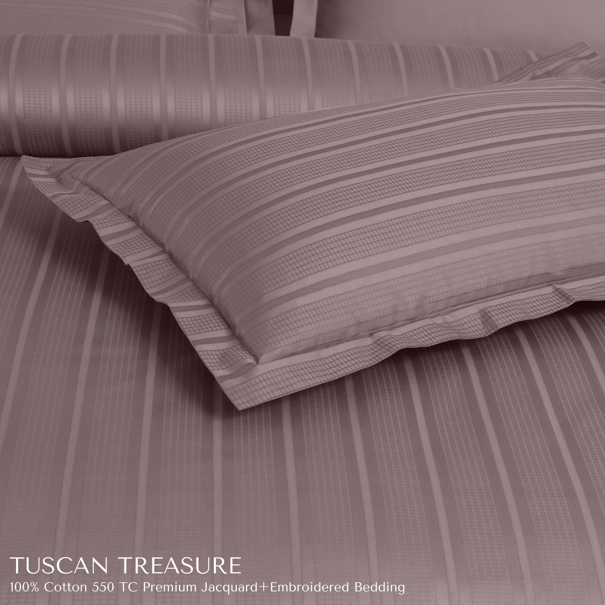 Crafted with care, the Tuscan Treasure Collection features 550TC pure cotton woven in a jacquard stripe design and detailed with exquisite embroidery. The wine shade adds dramatic elegance—perfect for elevating your bedroom into a cozy, stylish sanctuary. Designed for durability and year-round comfort, this duvet cover makes luxury effortlessly accessible.